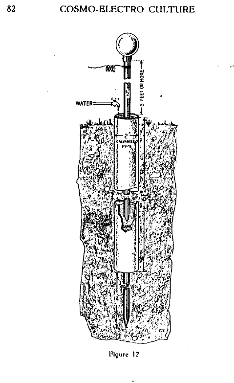 I made an 'Electro-Culture Pipe', following the directions from George Starr White's _Electroculture for Land and Man_. I had to substitute a narrow copper pipe (~$12) for the copper grounding rod. For the capacity at the top, instead of using a bronze or copper ball I instead made a resin+copper powder (50/50) cast in a 2" diameter silicone ball (dog toy, $1), and then bored out a 1/2" hole. The hole for the 5'6" long x 2" diameter galvanized steel pipe ($10, 'conduit') is about 5' deep. The copper rod was 10' and is about 2' deeper into the ground than the steel pipe. The copper rod is surrounded with wet sand ($4 bag) and is not in contact with the steel pipe. I wound a 14 guage insulated copper wire around the copper rod and ran that about 20 feet up to a more accessible location. At the other end of the wire I have tried a couple things. 1) Just coiling the a foot or so of bare wire around my left wrist. 2) Inserting a couple inches of bare wire into a pyramid I made from the 'N-mixture' (manganese dioxide + hardened carbon + magnetite + resin). 1) yielded a set of visceral sensations much like the 'vitic rods' (steel rod in left hand, carbon rod in right hand), sort of a 'buzzing' feeling and the sense of my pulse throughout my body and the sense of not caring to move or get up. The pyramid has yielded some more interesting results. After lying prone while holding said pyramid in my left hand for some minutes with eyes closed, I opened my eyes to the canopy of trees overhead. I saw the same 'neural discharge' pattern in the sky that I often see, but in greater clarity than typical. The discharge patterns and like bright specks that transit one of hundreds of fixed (in space) squiggle patterns over the course of 1 second or so. Also, in looking past the branches and leaves, I could see a distinct white glow (aura) around the perimeter of each tree against the blue sky.